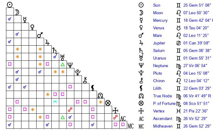 | Sun | 25 Gemini 51 | 26 Gemini 45 | 15 Virgo 24 |