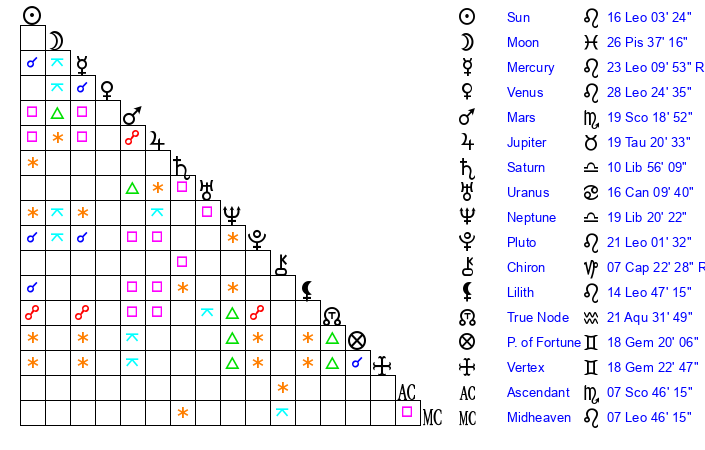 | Mercury | 23 Leo 10 | 4 Leo 37 | 13 Scorpio 55 |