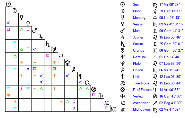 | Moon | 29 Capricorn 14 | 27 Aries 58 | 2 Aquarius 11 |