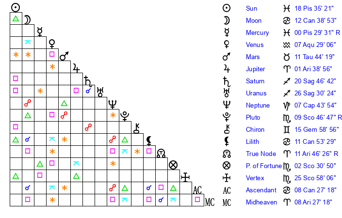 | Moon | 12 Cancer 34 | 26 Cancer 47 | 29 Scorpio 59 |