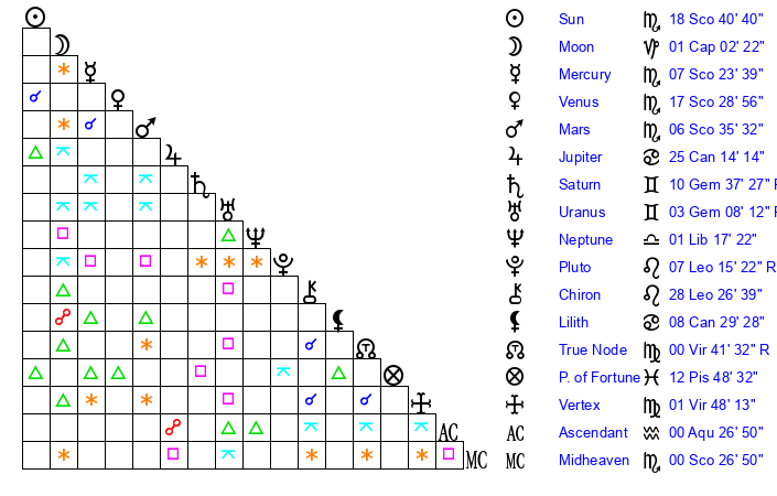 | Sun | 18 Scorpio 41 | 19 Scorpio 33 | 12 Aquarius 59 |