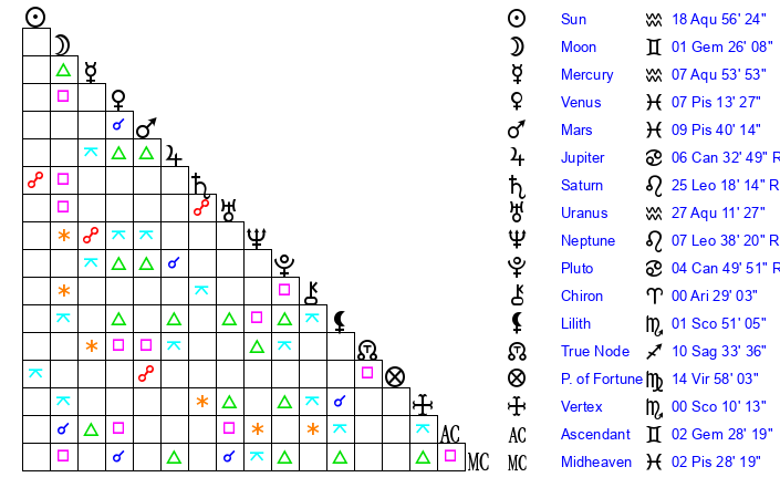 Sun | 18 Aquarius 56 | 20 Aquarius 14 | 3 Gemini 27 |