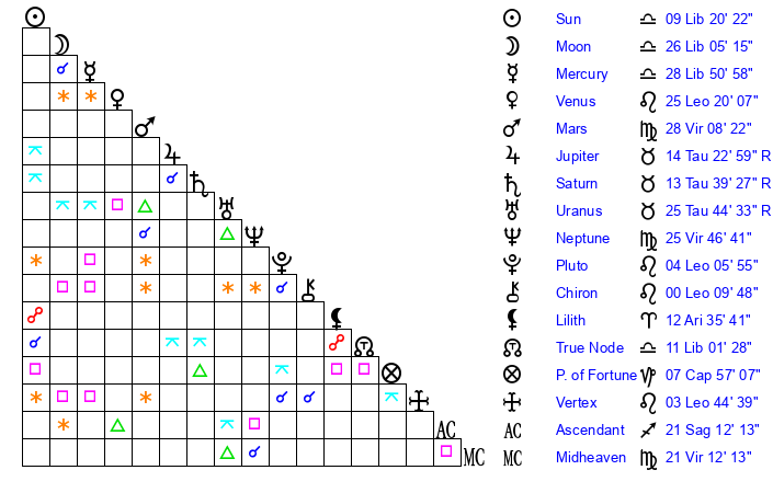 | Moon | 25 Libra 59 | 11 Aquarius 25 | 6 Sagittarius 20 |