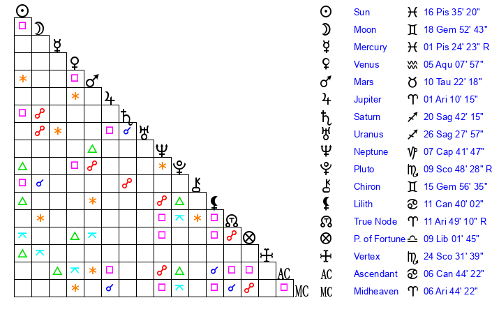 | Sun | 16 Pisces 35 | 17 Pisces 22 | 24 Aries 13 |