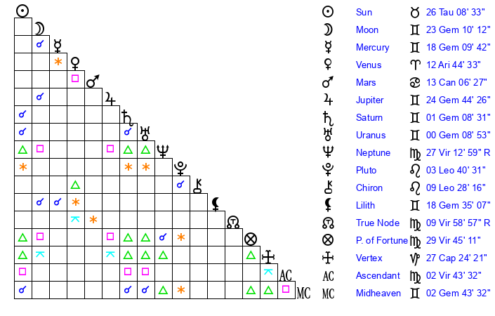 | Sun | 26 Taurus 9 | 27 Taurus 2 | 15 Leo 30 |