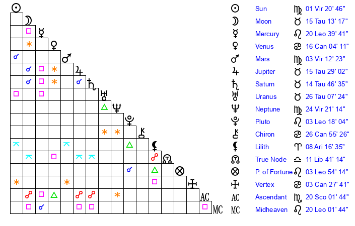 | Moon | 15 Taurus 7 | 18 Virgo 54 | 24 Gemini 50 |
