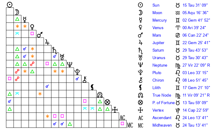 | Moon | 5 Aquarius 16 | 10 Virgo 57 | 17 Aquarius 24 |