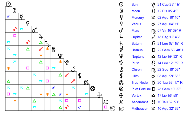 | Mercury | 2 Aquarius 10 | 10 Capricorn 38 | 18 Pisces 19 |