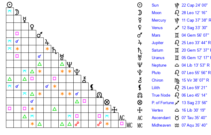 | Pluto | 7 Leo 55 | 1 Aquarius 27 | 6 Leo 27 |