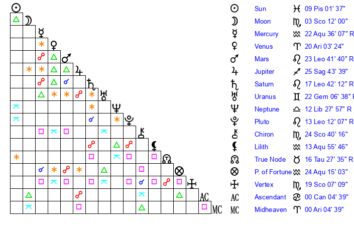 | Moon | 3 Scorpio 7 | 19 Pisces 32 | 20 Leo 27 |