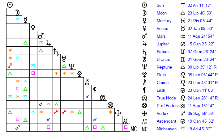 | Sun | 2 Aries 12 | 3 Aries 19 | 21 Gemini 48 |