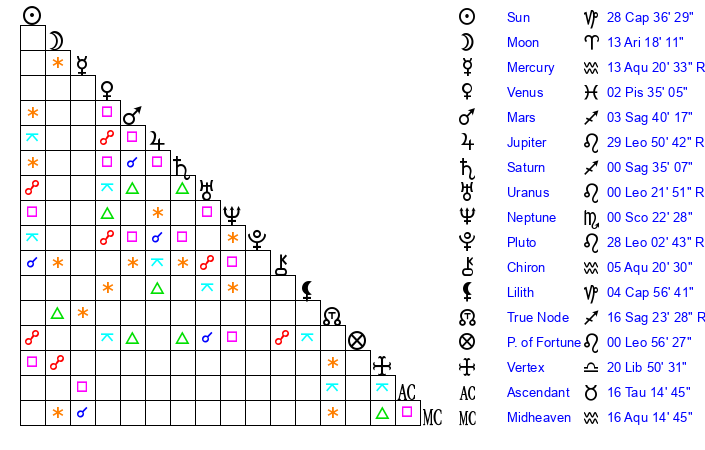 | Moon | 13 Aries 20 | 6 Libra 37 | 4 Scorpio 39 |