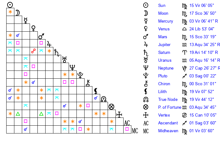 | Sun | 15 Virgo 6 | 15 Virgo 19 | 12 Libra 29 |