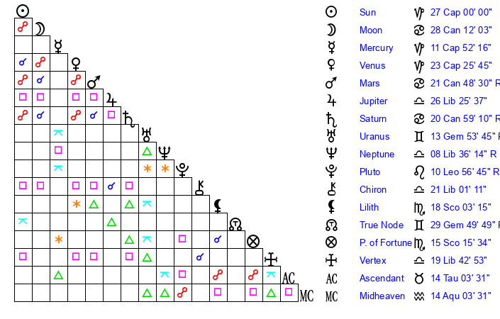| Sun | 27 Capricorn 0 | 27 Capricorn 50 | 16 Aries 17 |