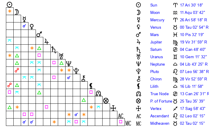 | Pluto | 7 Leo 56 | 3 Aquarius 38 | 8 Leo 50 |