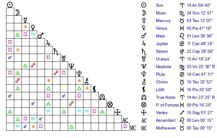 | Sun | 14 Aries 57 | 16 Aries 9 | 15 Cancer 33 |