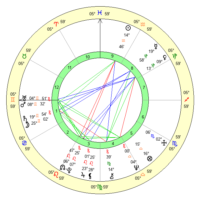 | Moon | 25 Gemini 2 | 7 Taurus 55 | 12 Gemini 33 |