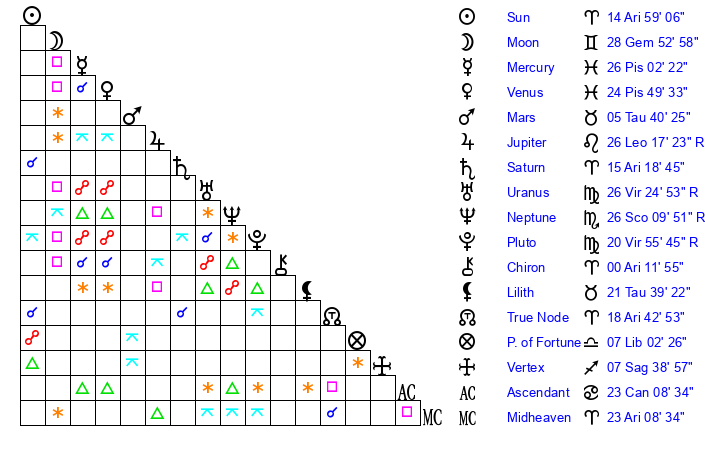 Sun | 14 Aries 59 | 15 Aries 10 | 10 Gemini 17 |