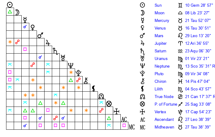 Uranus | 1 Virgo 27 | 28 Taurus 10 | 4 Virgo 4 |