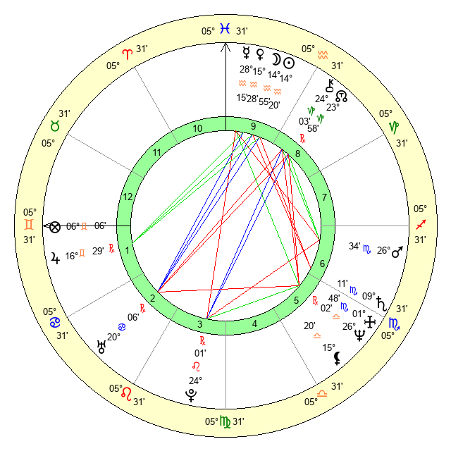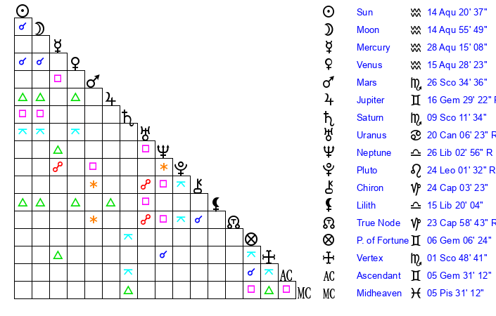 | Moon | 14 Aquarius 54 | 23 Aries 41 | 27 Virgo 26 |