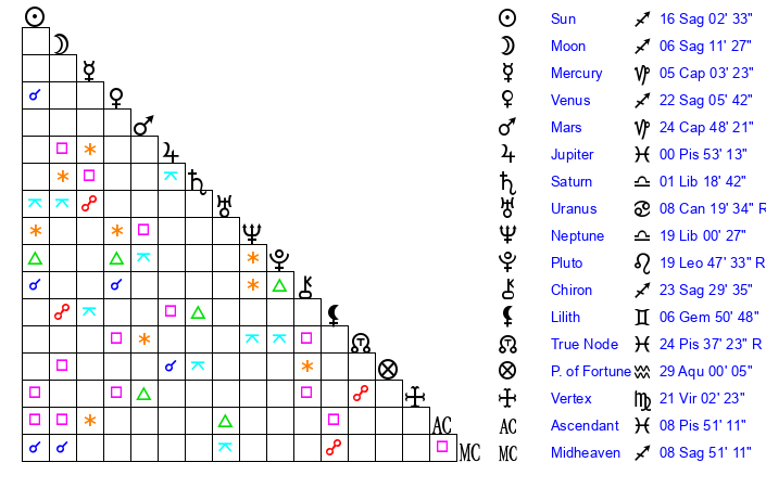 | Sun | 16 Sagittarius 3 | 16 Sagittarius 51 | 2 Pisces 16 |