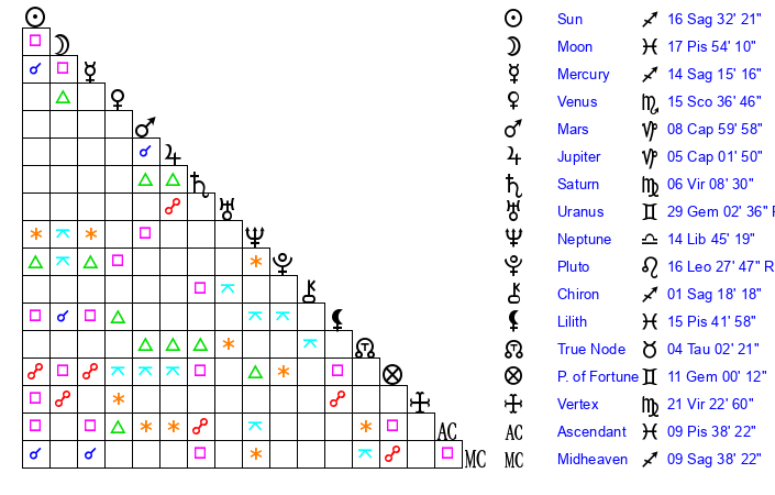 | Sun | 16 Sagittarius 32 | 16 Sagittarius 51 | 4 Pisces 46 |
