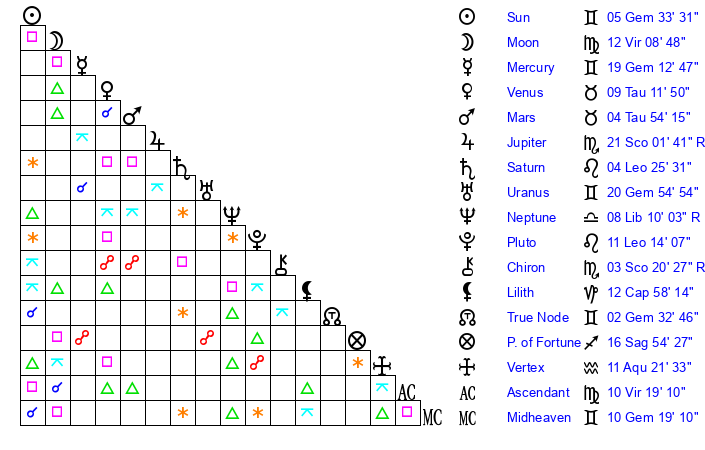| Mercury | 19 Gemini 13 | 3 Gemini 37 | 4 Leo 55 |