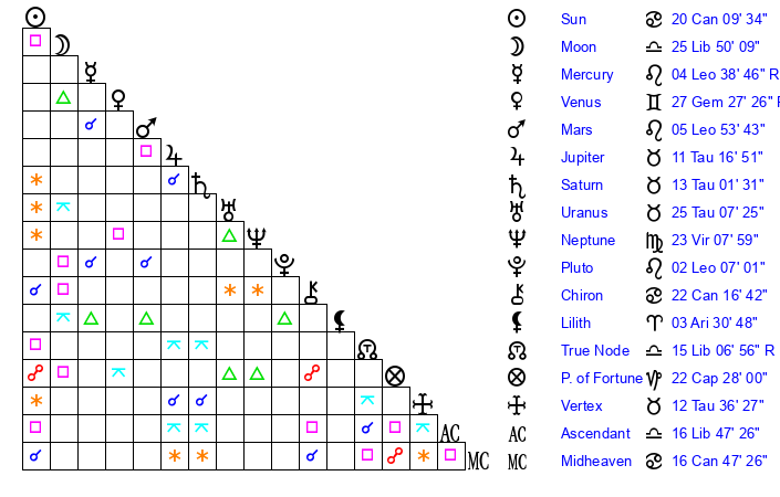 | Venus | 27 Gemini 26 | 8 Gemini 58 | 28 Leo 41 |