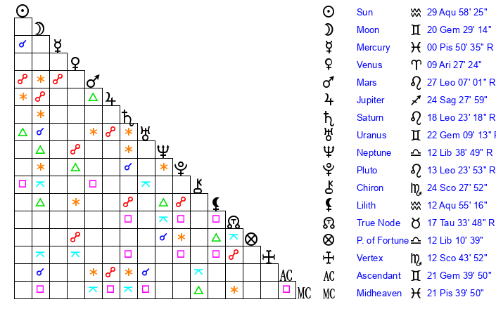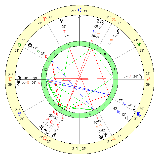 | Moon | 20 Gemini 39 | 19 Scorpio 53 | 17 Aries 20 |
