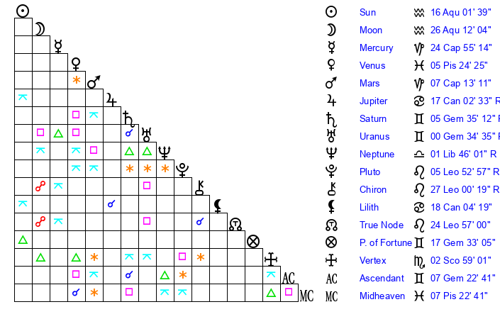 | Moon | 26 Aquarius 13 | 22 Taurus 2 | 25 Aquarius 35 |