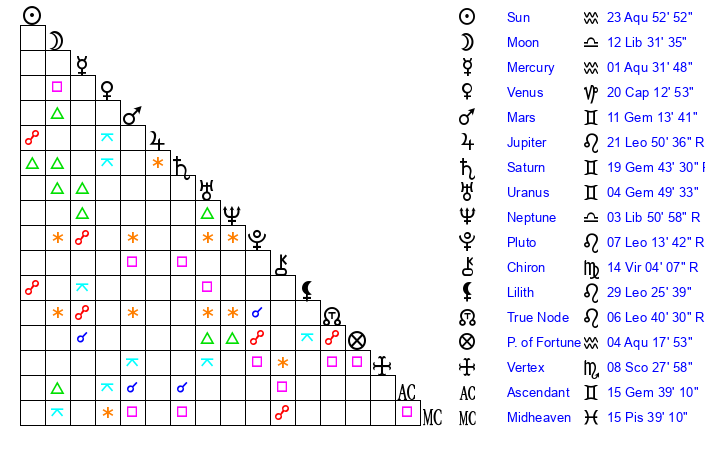 | Sun | 23 Aquarius 53 | 25 Aquarius 15 | 14 Taurus 5 |