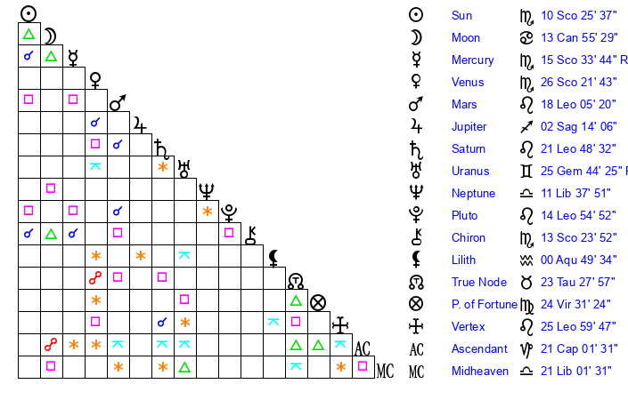 | Pluto | 14 Leo 54 | 1 Aquarius 27 | 14 Leo 5 |
