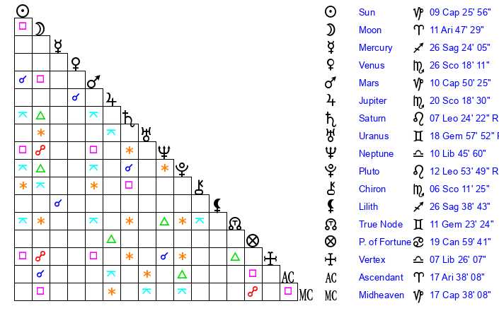 | Neptune | 10 Libra 46 | 29 Pisces 29 | 9 Libra 43 |