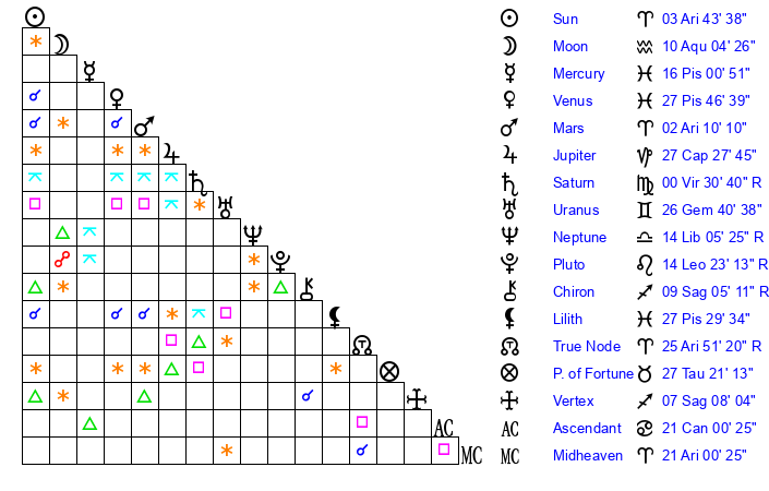 | Sun | 3 Aries 44 | 4 Aries 18 | 17 Gemini 33 |