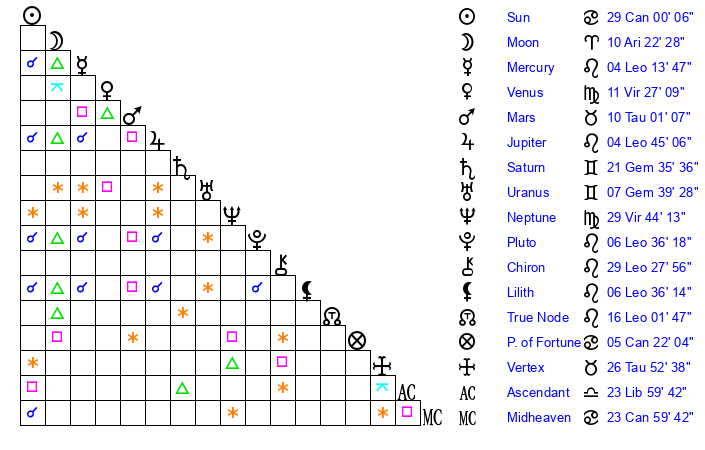 | Moon | 10 Aries 24 | 2 Cancer 37 | 7 Aries 9 |