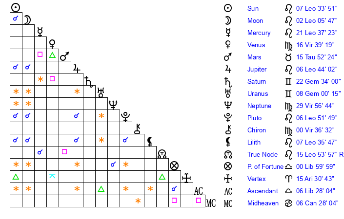 | Sun | 7 Leo 34 | 8 Leo 42 | 27 Libra 23 |