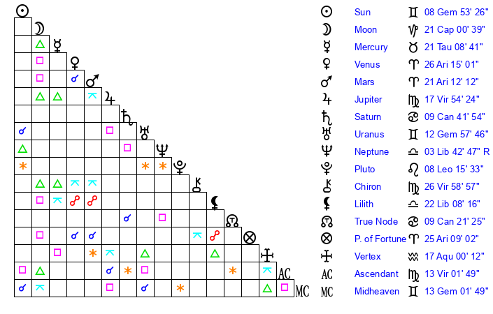 | Mars | 21 Aries 13 | 20 Leo 22 | 17 Gemini 32 |