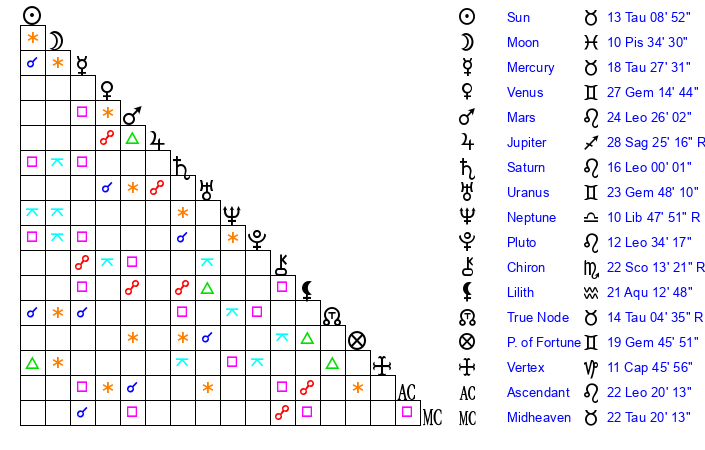 | Sun | 13 Taurus 9 | 13 Taurus 30 | 26 Cancer 54 |