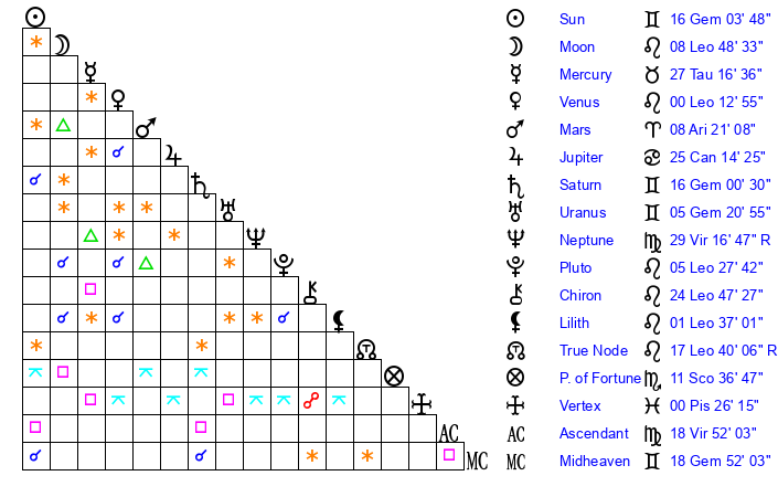 | Sun | 16 Gemini 4 | 17 Gemini 12 | 4 Virgo 30 |