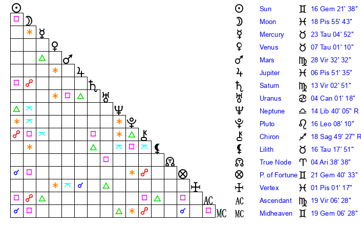 | Jupiter | 6 Pisces 44 | 29 Gemini 31 | 2 Pisces 56 |