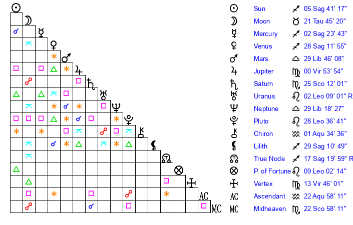 | Sun | 5 Sagittarius 41 | 6 Sagittarius 43 | 16 Aquarius 53 |