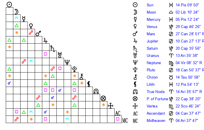 | Moon | 2 Libra 6 | 2 Gemini 39 | 9 Pisces 55 |