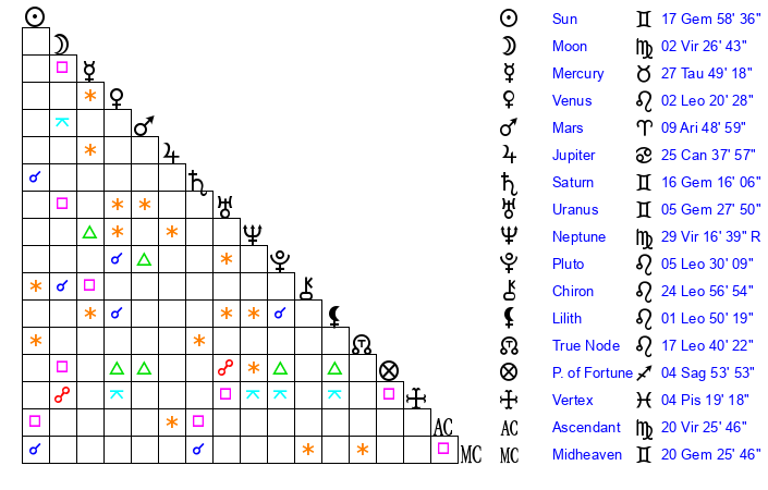 | Sun | 17 Gemini 59 | 19 Gemini 6 | 6 Virgo 26 |