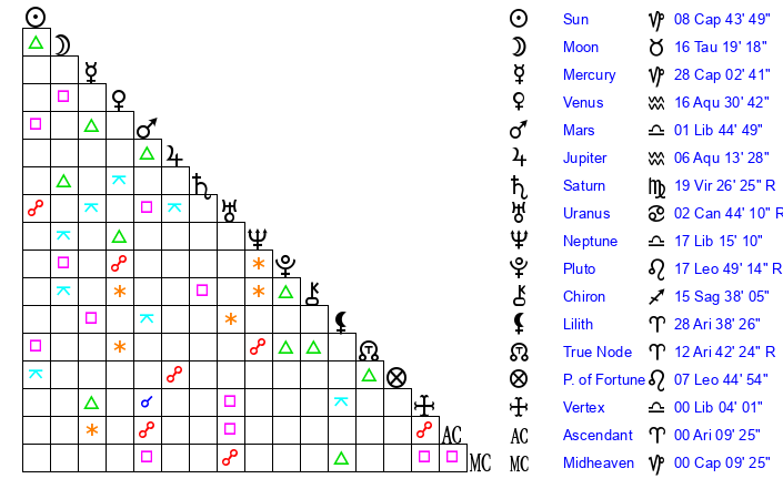 | Neptune | 17 Libra 15 | 29 Pisces 29 | 16 Libra 32 |