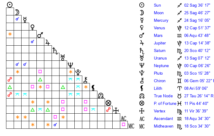 | Uranus | 13 Sagittarius 9 | 29 Taurus 19 | 15 Sagittarius 36 |