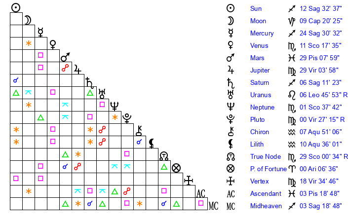 | Sun | 12 Sagittarius 32 | 12 Sagittarius 48 | 22 Aquarius 43 |
