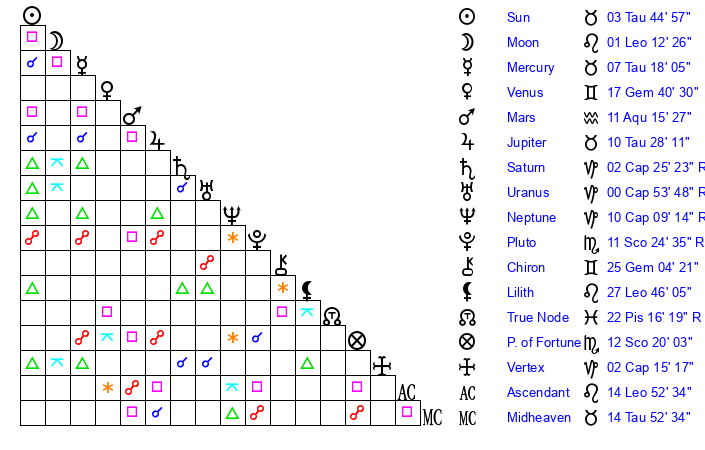 | Moon | 1 Leo 15 | 6 Pisces 54 | 0 Sagittarius 2 |