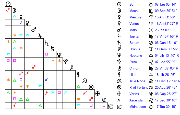 | Sun | 7 Taurus 4 | 7 Taurus 41 | 23 Cancer 46 |