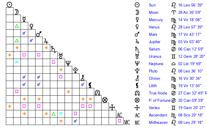 | Pluto | 8 Leo 36 | 2 Aquarius 13 | 10 Leo 13 |