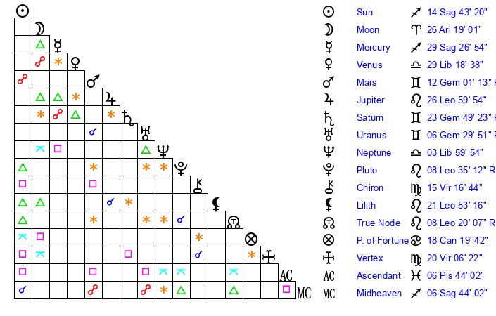 | Sun | 14 Sagittarius 43 | 15 Sagittarius 50 | 8 Pisces 0 |